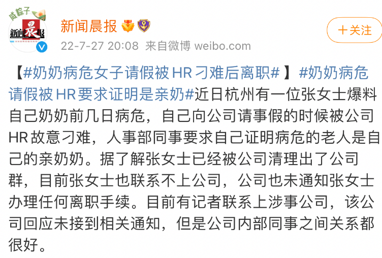 您現(xiàn)在的位置是: 首頁 > 人才招聘 > 主播招聘 主播招聘 家人病危請假,被HR要求證明是奶奶是親奶奶。 2022-08-07 主播招聘 加入收藏 這是 HRGO | 人力資源分享匯 的第 2281 篇原創(chuàng)文章 ?HRGO新媒體編輯部 編輯-Sam 排版-阿正 校對-Josh事情的大概是這樣的:杭州有一位張女士,前陣子奶奶病危,想要請假卻被HR刁難。HR要求張女士自己證明病危的老人是自己的親奶奶。這就很離譜。媒體也報道了,公司內(nèi)部同事之間關(guān)系都很好。但HR還是做出了讓人覺得惡心的事情,這又是為什么呢?根據(jù)當(dāng)事人陳述:公司HR要求張女士自己補充老人戶口本、身份證等信息,證明病危的老人是張女士奶奶本人。因為張女士不愿意提供其奶奶的相關(guān)信息,雙方鬧出僵局,最終張女士無奈提出離職。這事兒,在邏輯上,看起來很簡單,但是背后其實有很大的惡意。而這個惡意是來自于這家公司。1、根據(jù)媒體爆料,這家公司的全稱是:杭州嘉X網(wǎng)絡(luò)科技有限公司,總參保人數(shù)是87人,屬于標(biāo)準(zhǔn)的中小企業(yè),那么就意味著,這家公司本身并不會有特別體系、固定、健全的內(nèi)部制度。2、就算是有制度,一個請假,就要設(shè)定得如此繁瑣且沒有人情味的流程,可以看出,這家公司的整體面貌,大概率是在業(yè)務(wù)上唯唯諾諾,在對待員工方面重拳出擊。3、從法律上來說,請喪假確實要提供死亡證明,但是真實的情況是奶奶病危,在當(dāng)事人在悲痛和焦急的狀況之下,還要求當(dāng)事人提供老人戶口本、身份證等信息來證明,簡直毫無人性!員工再濫請假,相信也不會拿親人開玩笑來請喪假。這樣毫無人情味的、一味要求「合規(guī)」的要求,只能說太像「無情的機器」了。4、從這個案例也可以看出,很多公司真的是把員工當(dāng)作是對立面,不信任員工的程度已經(jīng)到了離譜的地步。說白了,如果真的是公司一定要走流程,好好和員工說下,等所有事情結(jié)束了后面再補上,也算一個變通。非要整這么難看,只能說這家公司的格局,太小了。5、根據(jù)媒體報道,當(dāng)?shù)夭块T深夜表態(tài)已經(jīng)介入核實調(diào)查。這說明整件事情,杭州的有關(guān)部門處理的效率是可以的。不過,這件事主要問題還是這家企業(yè)的企業(yè)文化問題。冷冷的制度,冰冷冷的管理,冰冷冷的流水線,只會讓優(yōu)秀的人才,離公司越來越遠。6、這件事情,也讓很多人又把矛頭指向了HR。但有一說一,各有各的職責(zé),這家公司的HR也在履職??雌饋鞨R做事死板,不近人情,這是他可以改善的地方,而在根本上,是公司不愿擔(dān)責(zé),不愿相信員工。7、最后,還有一個勞動法方面的問題:你看,張女士奶奶病危,她請的肯定是事假,并不是喪假,而奶奶去世是無法請喪假的,那么請事假何需證明?家里有事是肯定可以請事假的呀。如果單位請休假制度無事假一項,那這家公司的鍋就更大了。國家規(guī)定的假日除了周末和法定節(jié)假日外,還有年休假、探親假、婚假、喪假、產(chǎn)假、工傷假、病假,還有事假。公司不批事假,明顯是不合法的。 希望這樣低級的錯誤,不要再犯了。一些企業(yè)真的是丟人!延伸閱讀:急!HR失誤多發(fā)工資,怎么追回?上班時間,曠工買藥,遇上車禍,算不算工傷?企業(yè)有許多需要防范應(yīng)對的法律風(fēng)險,這時候,熟知勞動法就很必要了。這里就推薦你《365天勞動法答疑社區(qū)》:每天僅需1塊錢全年享受專業(yè)勞動法律師隨時在線咨詢答疑服務(wù)高質(zhì)量社群365天每天1個法律小知識獨家《勞動法1000問》電子刊最新勞動法資料……掃描下方二維碼限時優(yōu)惠,先到先得↓↓↓需要咨詢詳細內(nèi)容掃描下方西瓜哥(ID:GGzhinang)二維碼限時優(yōu)惠,先到先得▼ 掃描關(guān)注微信公眾號,第一時間獲取網(wǎng)站最新動態(tài) 轉(zhuǎn)載請說明來源于"邯鄲英才網(wǎng)" 本文地址:http://www.51tyzc.com/zhichanggonglue/20077.html 上一篇 面試過500位HR,這10條規(guī)律神準(zhǔn)! 下一篇 亂發(fā)工資,公司要付出10倍的代價。 相關(guān)文章 文章評論